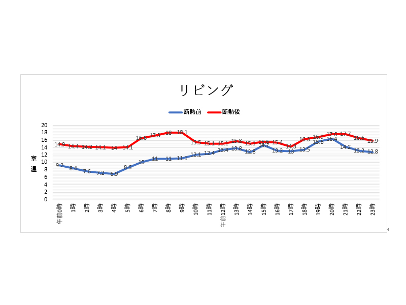 断熱リフォーム前と後の室温を検証しました。グラフをご参照ください。