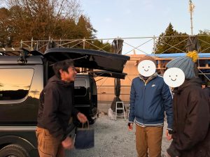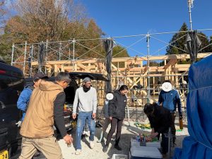 当日の朝はちらちらと雪が舞い、澄んだ空が広がるなか いざ迎えた上棟当日。