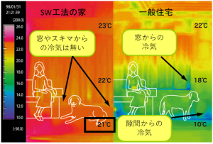 断熱性を高めると、暖かい空気が上に溜まって足元が寒い。